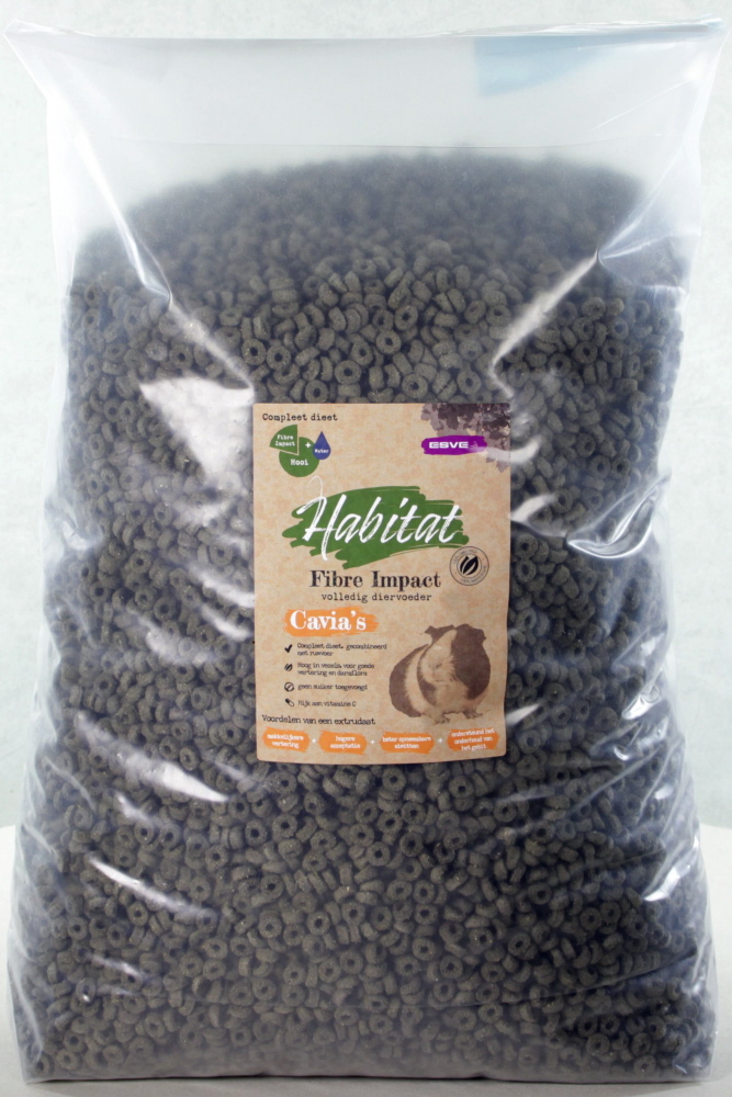 Plantaardige vezels uit planten, grassen en kruiden vormen in de natuur het dieet voor een gezonde cavia. Een mix van deze producten hebben wij als ingrediënten gekozen voor Habitat Fibre Impact. Het verteringsstelsel van cavia’s is hier volledig op ingericht waardoor dit een optimale vertering geeft en zorgt voor een uitstekende opname van bouwstoffen en energie uit deze vezels.