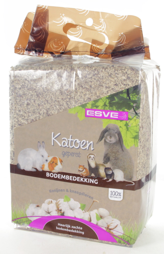 Gebruiksaanwijzing: Breng een dikke laag Katoen ESVE in het hok en druk het aan tot een laag van 2-3 cm. Breng in het hok een wat dikkere laag aan in de hoek waar het dier gewoonlijk zijn behoefte doet. Ververs alleen die hoeken om de paar dagen. Het hok in zijn geheel verschonen (afhankelijk van het dier) 1x per week (bij ratten) of 1x per 14 dagen (of langer bij konijnen). Bewaar Katoen ESVE droog en koel.