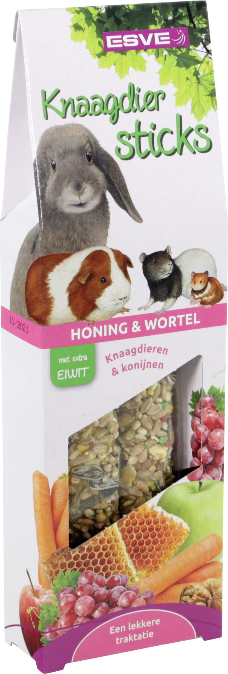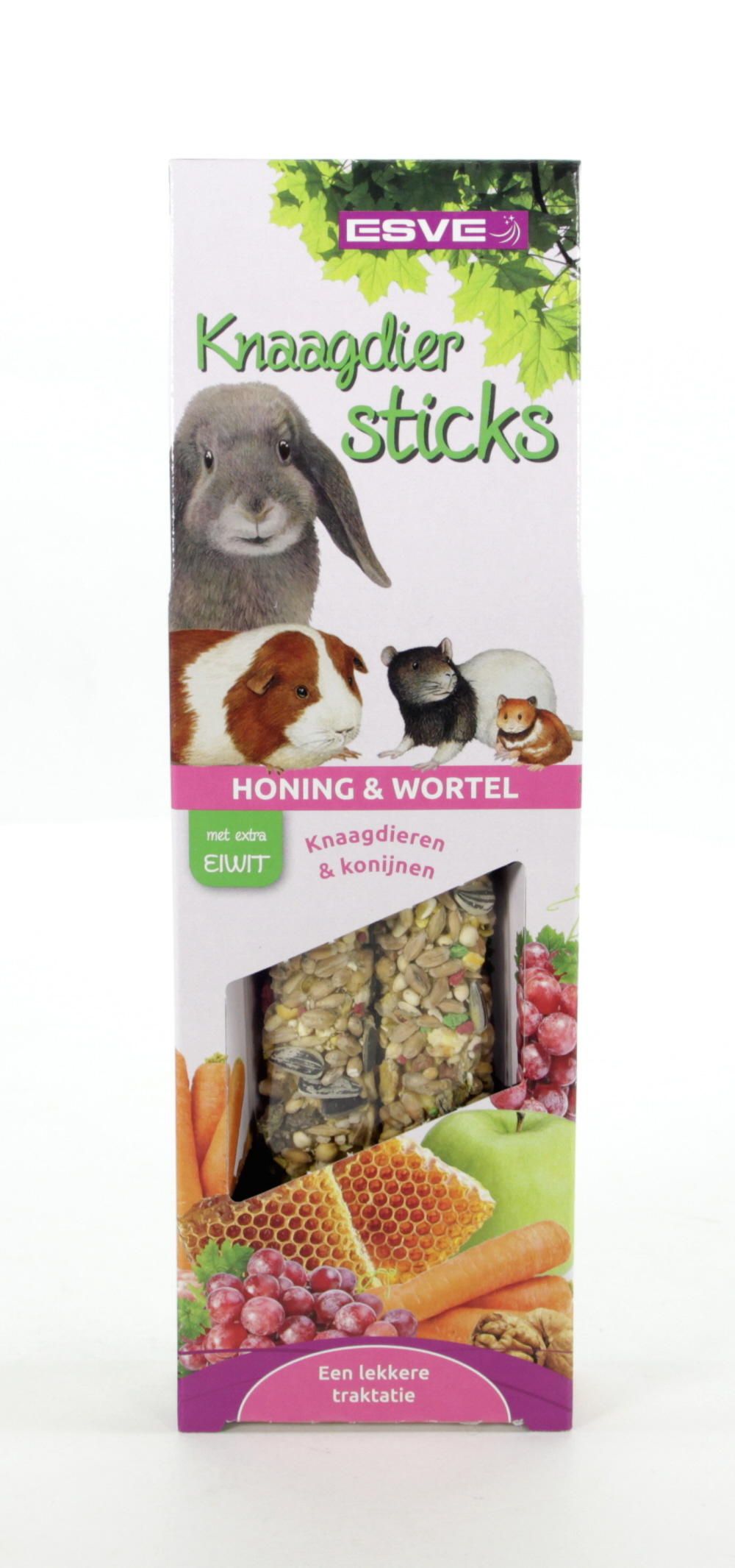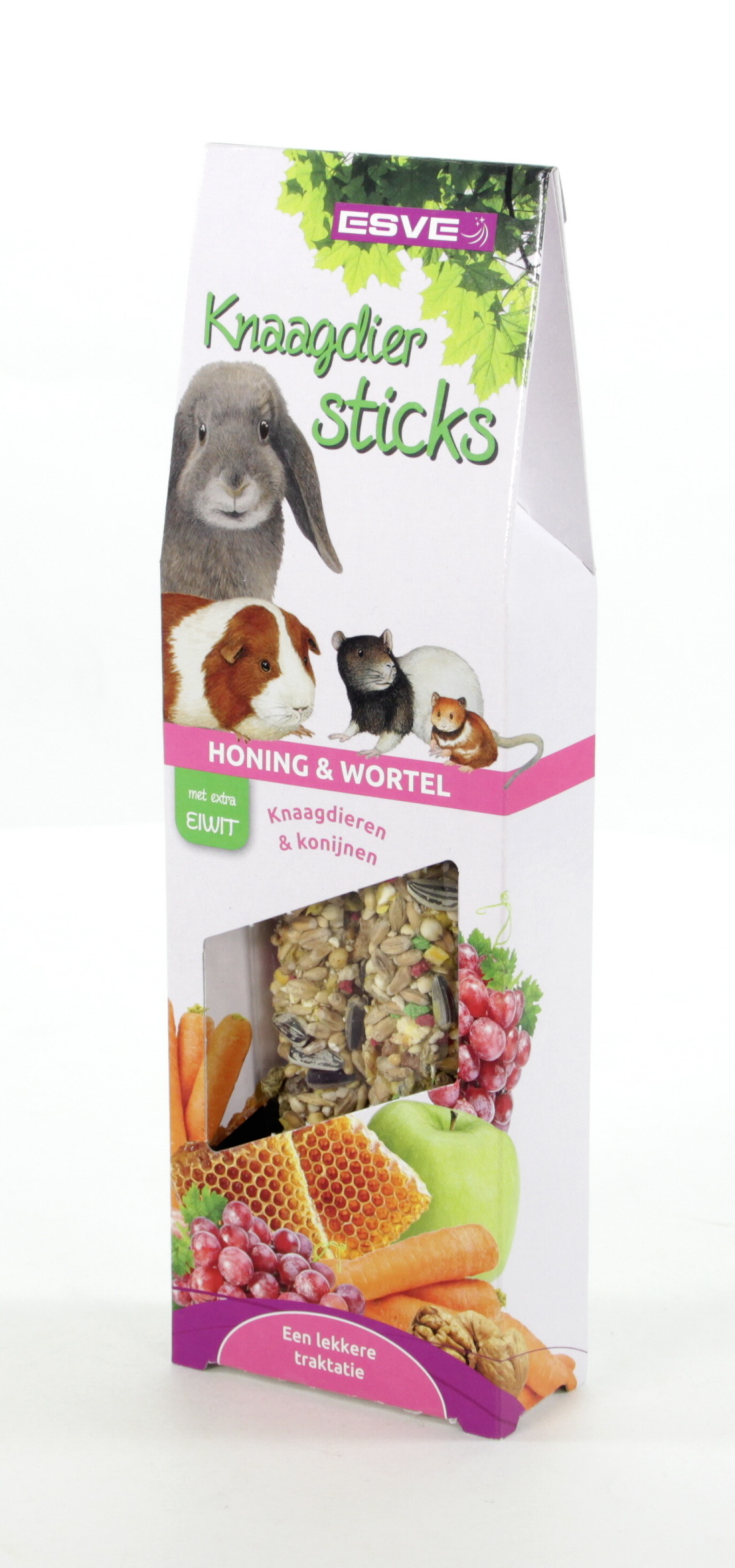 ESVE Sticks zijn smaakvolle voedings- en traktatie stangen, boordevol belangrijke voedingsstoffen, geheel afgestemd op de behoefte van uw konijn/knaagdier. Bij de samenstelliing is o.a. gebruik gemaakt van de beste grondstoffen welke knaagdieren graag tot zich nemen. Aangevuld met de noodzakelijke vitamines, welke de weerstand verhoogt en bijdraagt tot gezonde dieren met een mooie vacht.