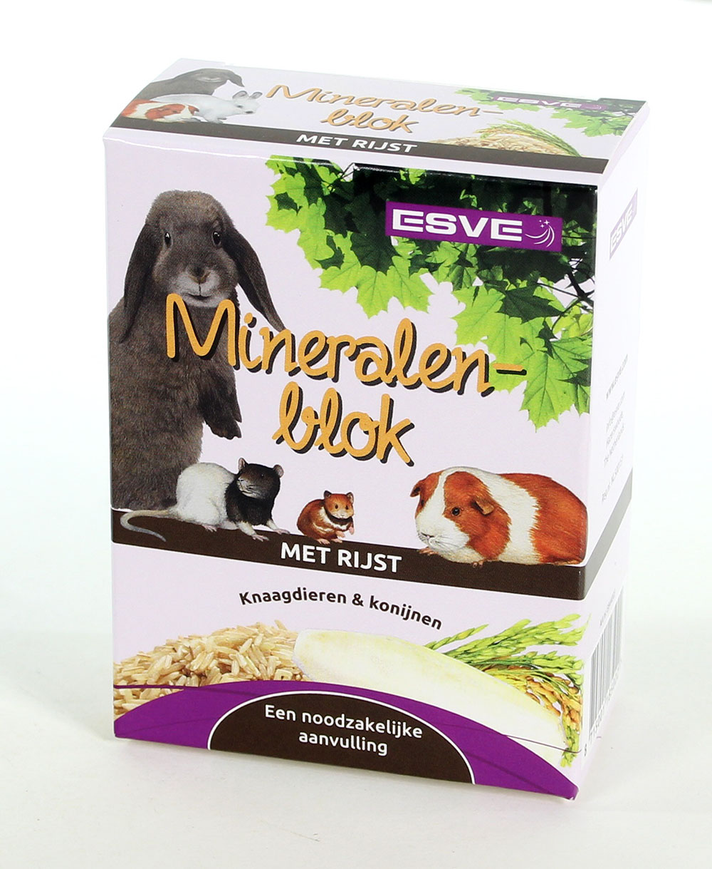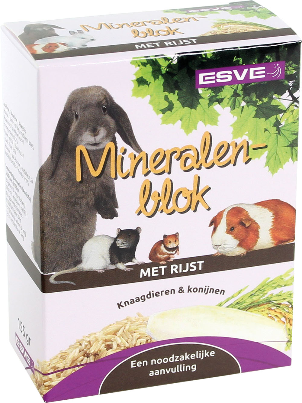 ESVE mineralenblok met rijst is een aanvullend mineraalvoeder, speciaal voor konijnen en knaagdieren. Deze zuiver natuurlijke lekkernij draagt bij tot een sterk bottengestel, een mooi gezonde vacht en bevredigt de natuurlijke knaagbehoefte. Om konijnen en knaagdieren gezond te houden mag ESVE Mineralenblok met rijst dan ook niet ontbreken.
