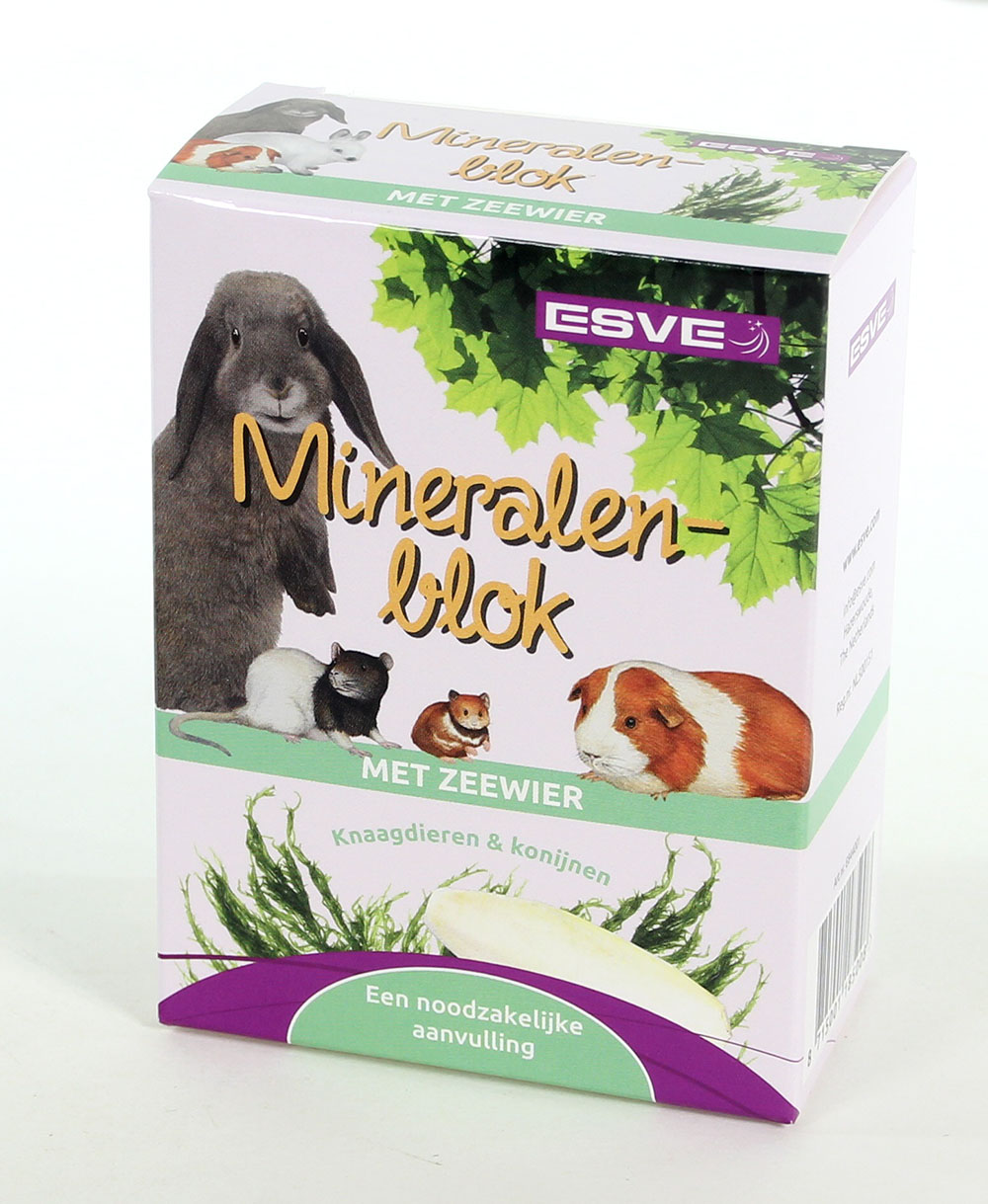 ESVE mineralenblok met zeewier is een aanvullend mineraalvoeder, speciaal voor konijnen en knaagdieren. Deze zuiver natuurlijke lekkernij draagt bij tot een sterk bottengestel, een mooi gezonde vacht en bevredigt de natuurlijke knaagbehoefte. Om konijnen en knaagdieren gezond te houden mag ESVE Mineralenblok met zeewier dan ook niet ontbreken.