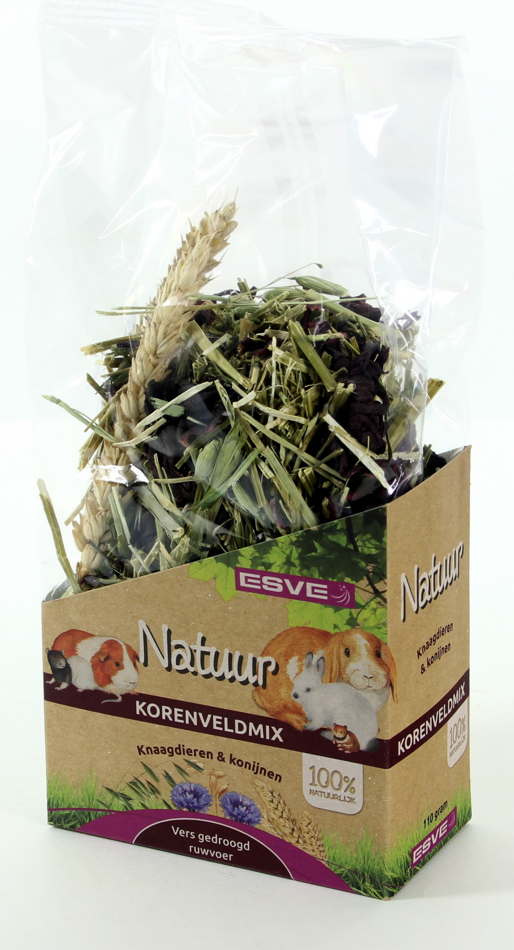 ESVE Natuur Korenveld-mix komt direct van het land en bevat een hoog percentage natuurlijke vezels. Dit zorgt voor een goede spijsvertering bij knaagdieren en konijnen. Hoe beter de spijsvertering, des te meer dit de gezondheid van uw huisdier bevordert. Aanvullend diervoeder voor hobby konijnen en knaagdieren.