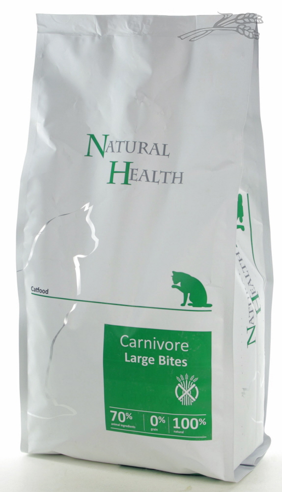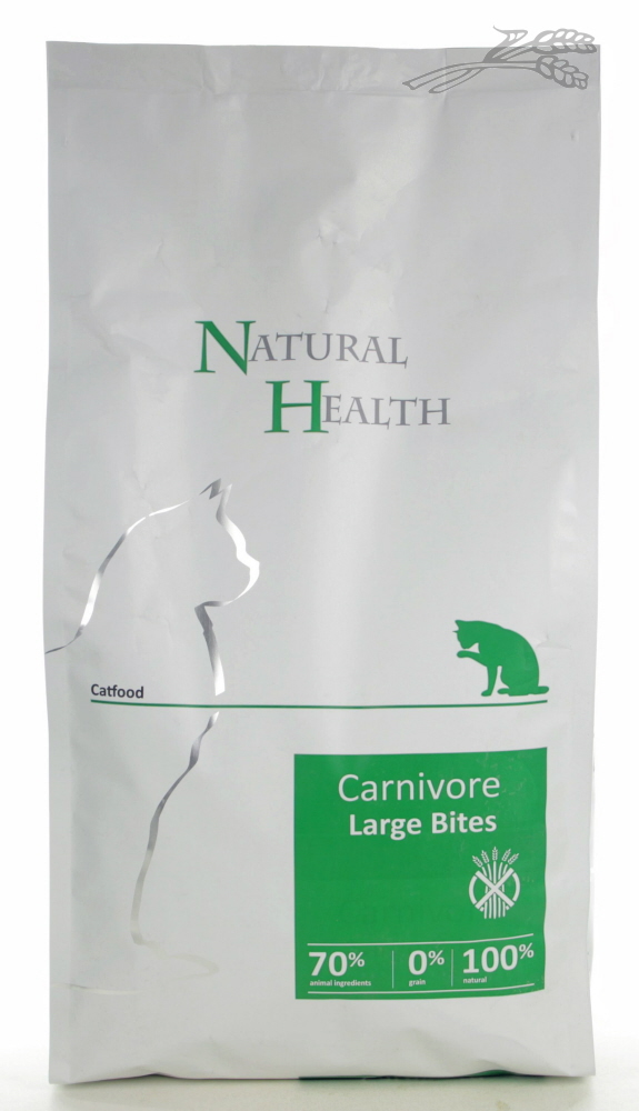 Natural Health Carnivore heeft een laag percentage zetmeel, een hoog percentage eiwit en is vrij van granen.