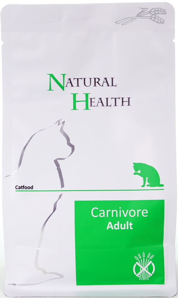 Natural Health Carnivore heeft een laag percentage zetmeel, een hoog percentage eiwit en is vrij van granen.