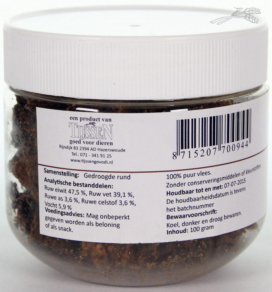 Ruw eiwit 47,5 %, Ruw vet 39,1 %, Ruwe as 3,6 %, Ruwe celstof 3,6%, Vocht 5,9 %.