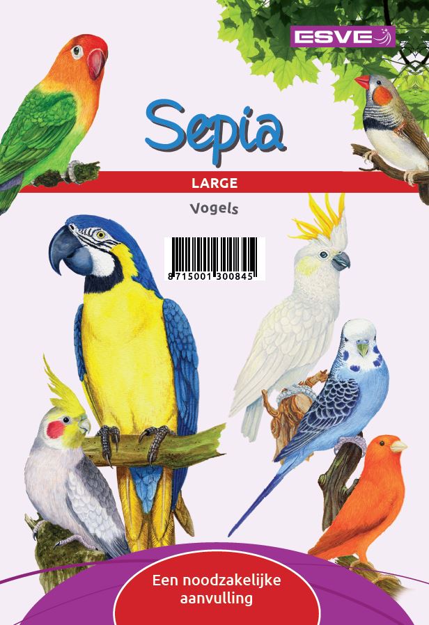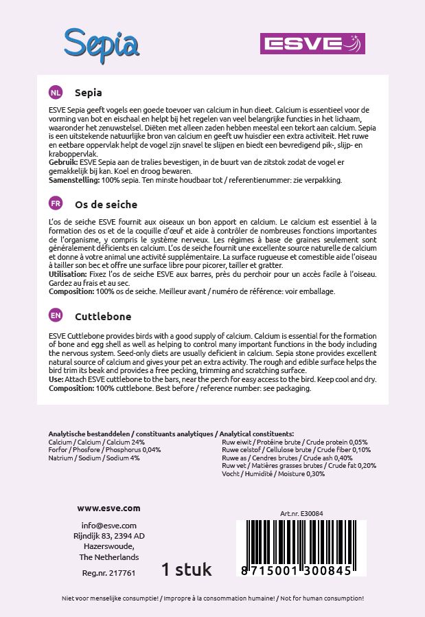 ESVE sepia is 100% natuurlijk en voorziet uw vogel(s) van onmisbare calcium en mineralen. Het is goed voor de bloedsomloop, het skelet en de eierschalen. Sepia heeft ook een “slijpfunctie“ waardoor snavel van de vogel scherp blijft.