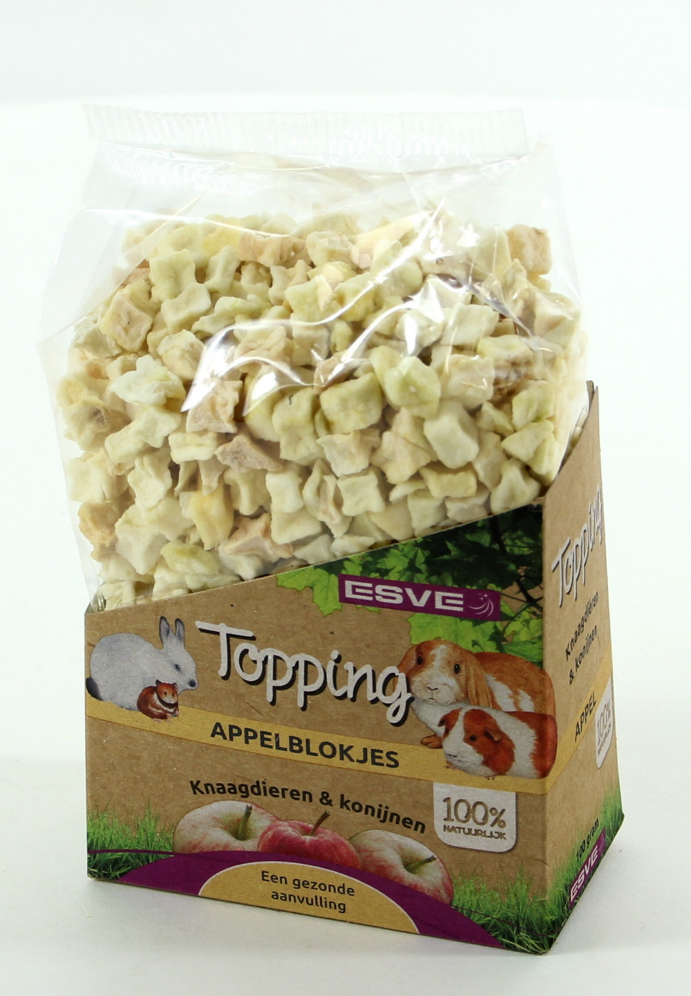 ESVE Appelblokjes is een lekkere, knapperige en gezonde traktatie voor uw huisdier. Bovendien bevat appel veel voedingsvezels. Door het formaat zijn ze ook handig voor kleine dieren.