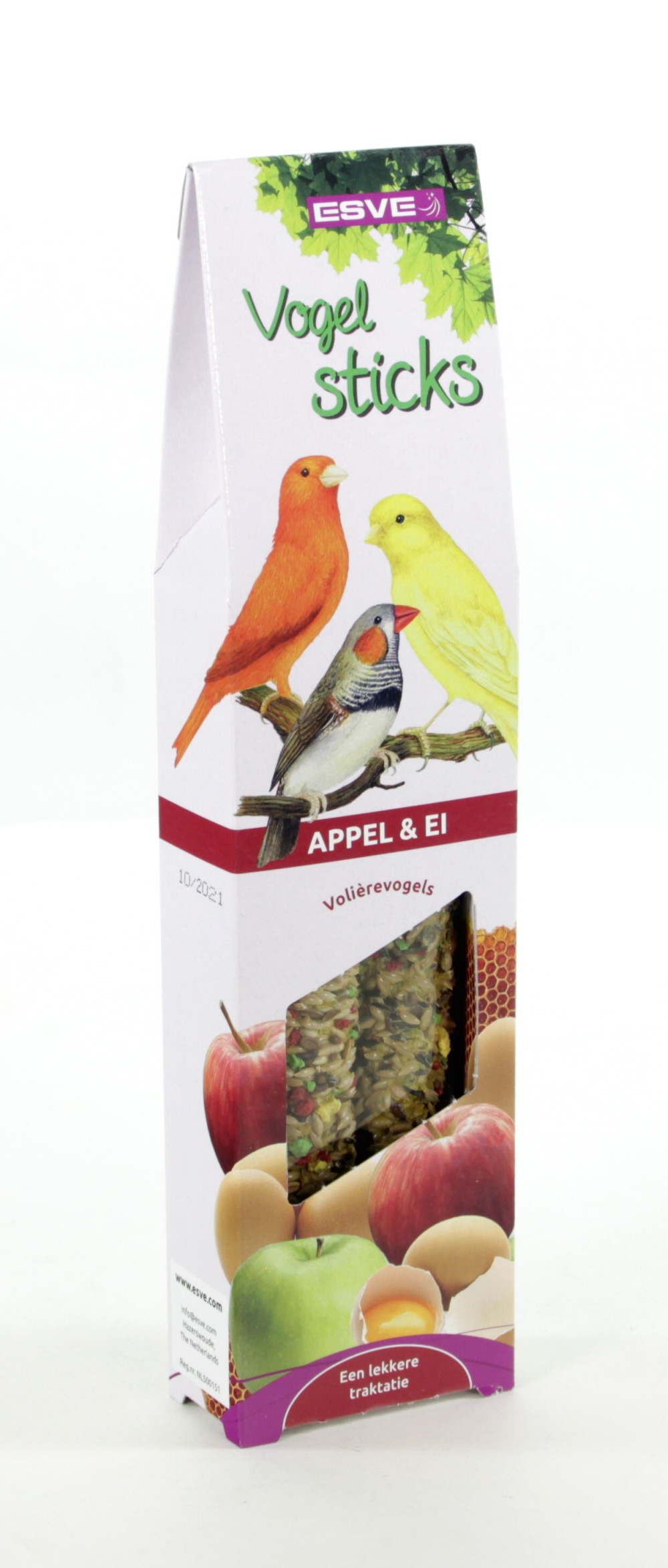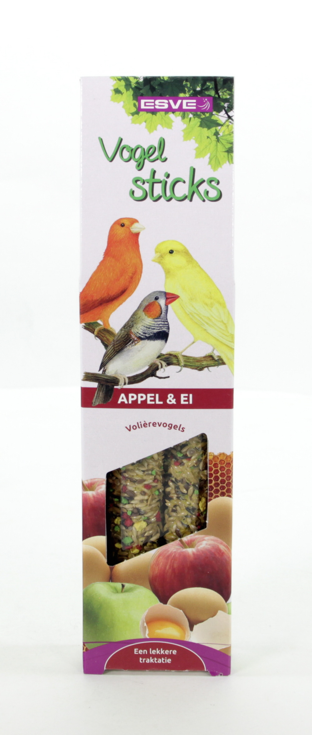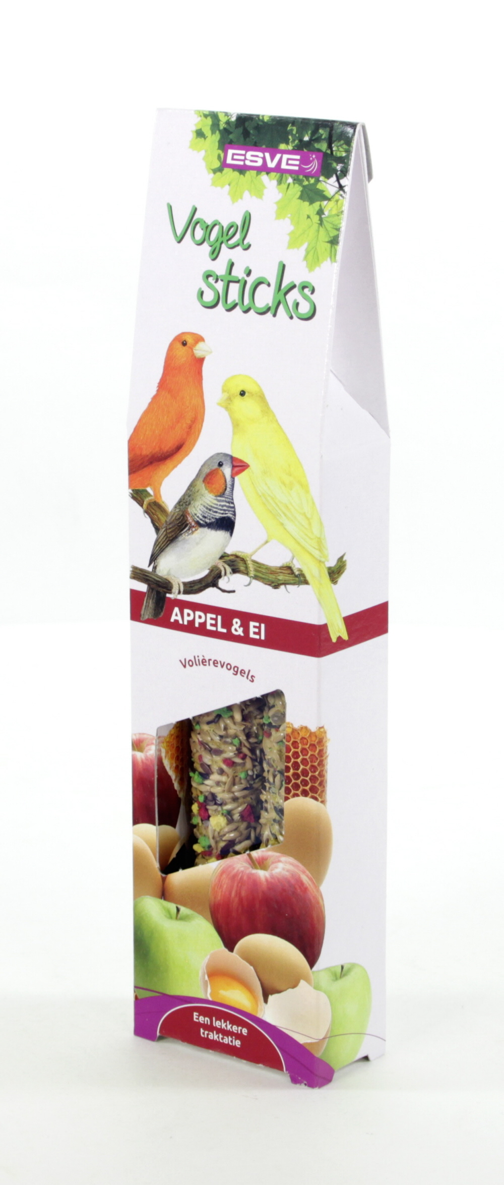 ESVE sticks zijn smaakvolle voedings- en traktatie stangen, boordevol belangrijke voedingsstoffen, geheel afgestemd op de behoefte van uw vogel(s). Bij de samenstelling is o.a. gebruik gemaakt van de zaden en grondstoffen die de vogel ook in de vrije natuur tot zich neemt, aangevuld met de noodzakelijke vitamines, die de weerstand verhogen en bijdragen aan een gezonde vogel met een mooie vederpracht.