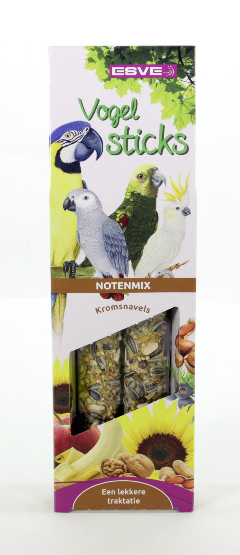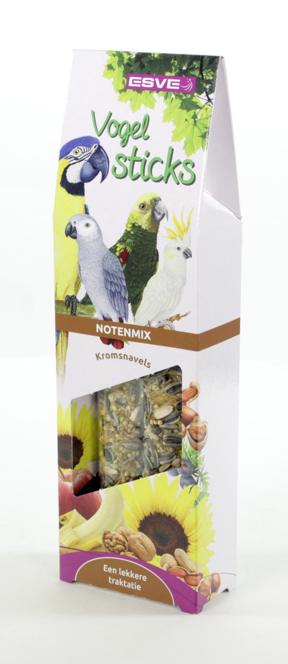 ESVE sticks zijn smaakvolle voedings- en traktatie stangen, boordevol belangrijke voedingsstoffen, geheel afgestemd op de behoefte van uw vogel(s). Bij de samenstelling is o.a. gebruik gemaakt van de zaden en grondstoffen die de vogel ook in de vrije natuur tot zich neemt, aangevuld met de noodzakelijke vitamines, die de weerstand verhogen en bijdragen aan een gezonde vogel met een mooie vederpracht.